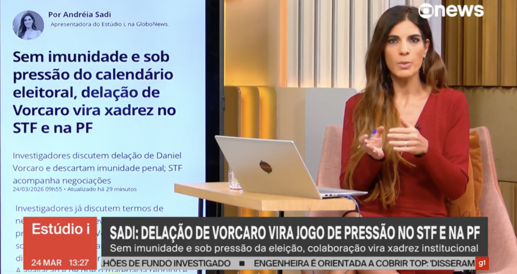 Andreia Sadi apurou que a possível delação de Daniel Vorcaro ainda está em fase de negociação e virou um impasse institucional no Supremo e na Polícia Federal por causa do período eleitoral. Segundo investigadores, há preocupação de que o acordo seja interpretado como interferência nas eleições e, por isso, há quem defenda deixar a decisão para depois do pleito, embora a expectativa atual seja avançar até junho ou julho.